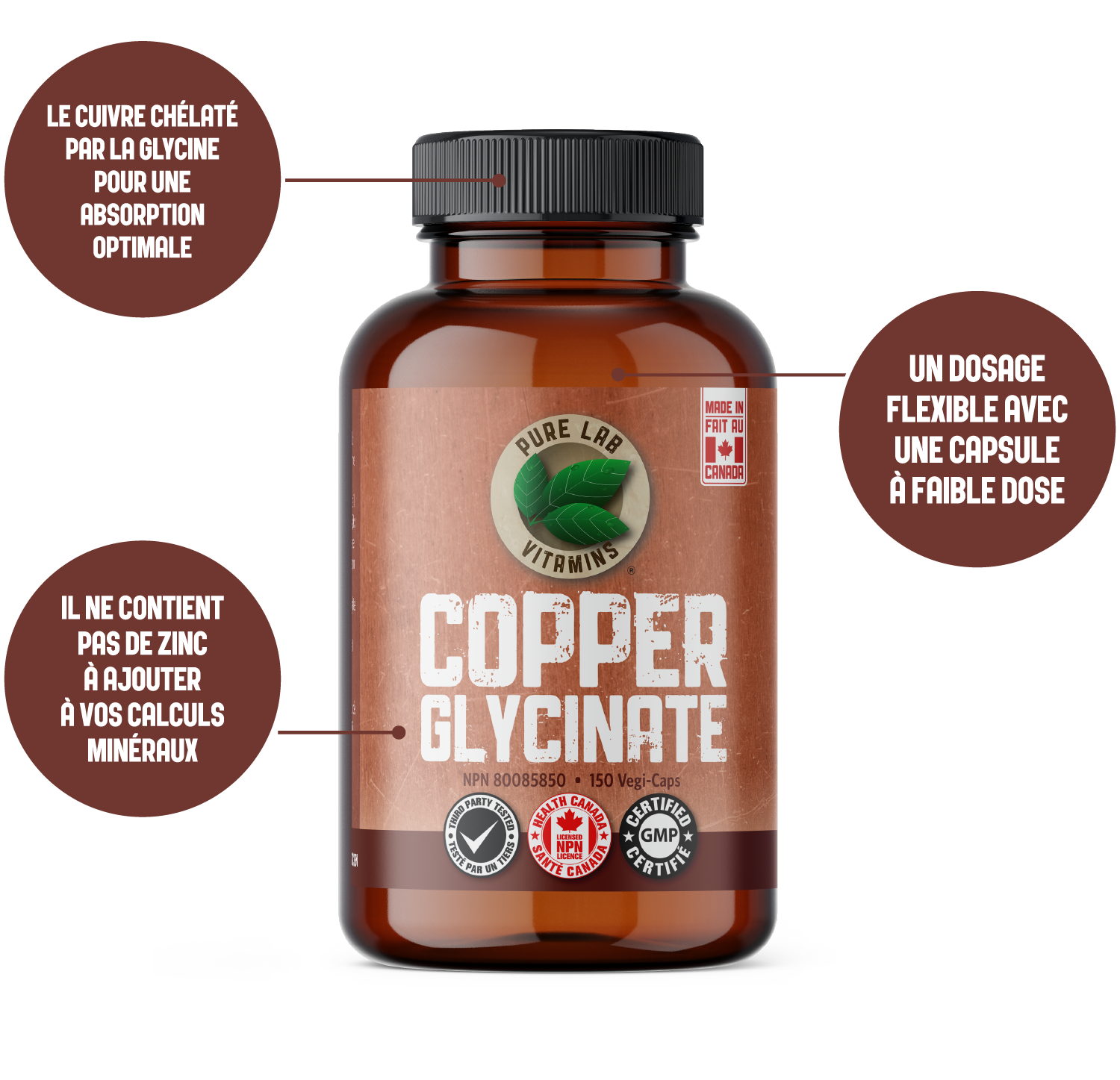 Le cuivre non chélaté est mal absorbé. La chélation (c.-à-d. l’attachement) du cuivre au plus petit acide aminé, la glycine, permet une absorption optimale de l’intestin dans le sang et une biodisponibilité accrue pour les tissus.