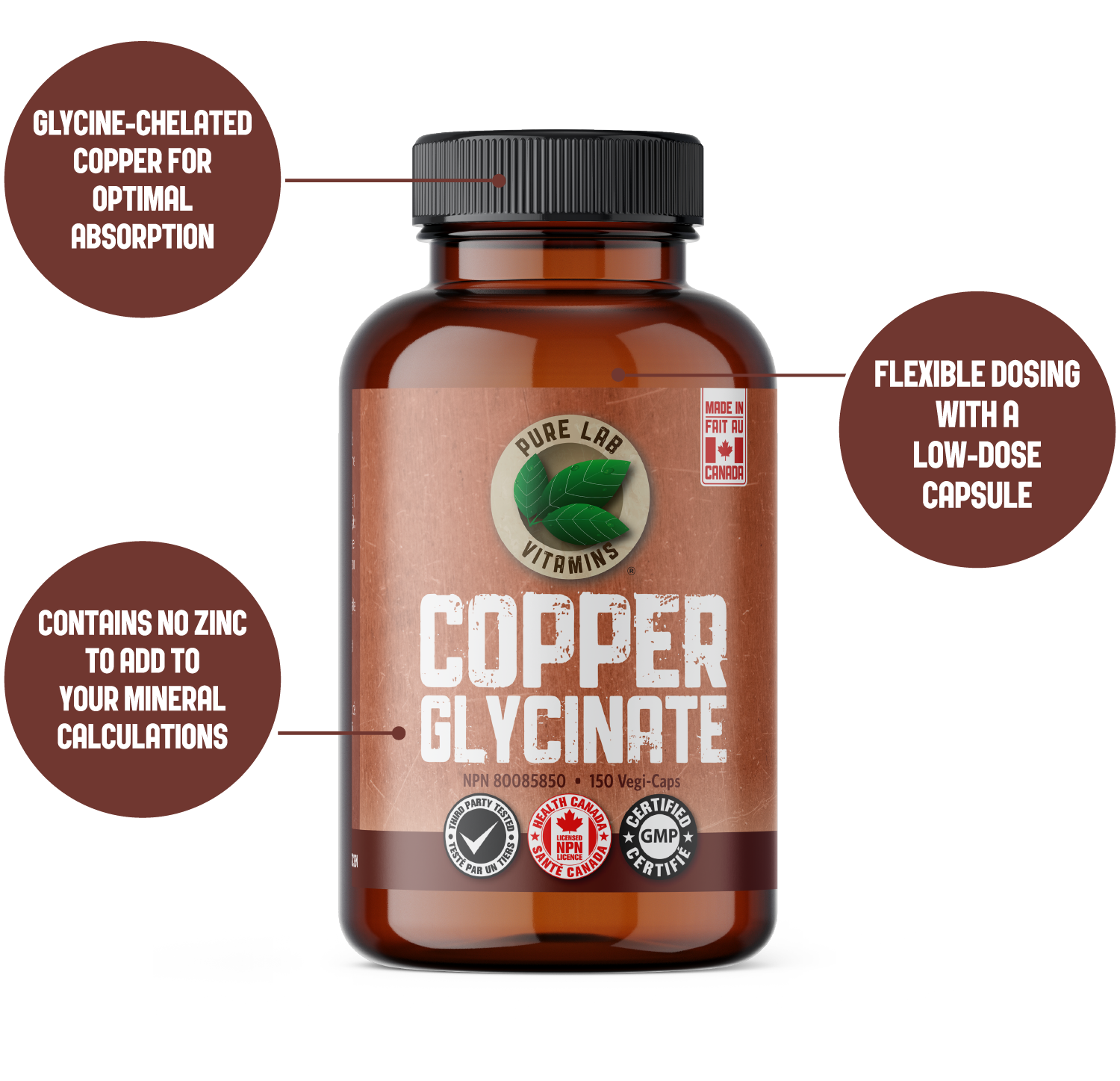 Pure Lab Vitamins Copper Glycinate is formulated with nature’s smallest essential amino acid, glycine, for optimal absorption from the gut into the bloodstream. At just 1 milligram per capsule, it provides flexibility. Individuals with diagnosed copper deficiency can take two capsules daily.
