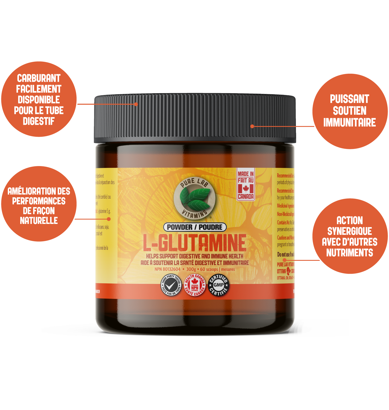 La L-glutamine de Pure Lab est offerte sous forme de capsules et de poudre. La poudre de L-glutamine de Pure Lab ne contient pas d’agents de remplissage – seulement de la L-glutamine pure à 100 %. Choisissez le format qui convient le mieux à votre mode de vie afin de profiter du soutien digestif, immunitaire ou musculaire que vous recherchez.