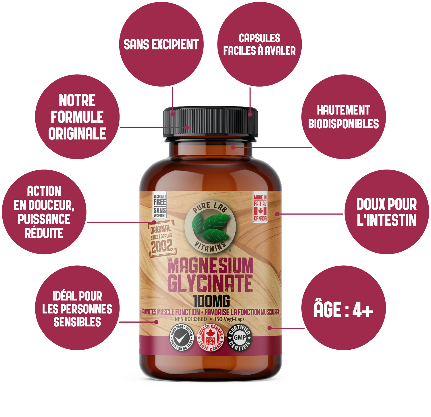 Pourquoi la glycine? La L‑glycine est le plus petit acide aminé et elle est essentielle à la santé humaine. Elle a un effet relaxant sur le système nerveux et elle a aussi des propriétés anti‑inflammatoires. C’est aussi l’un des trois éléments constitutifs du glutathion, ce qui fait du glycinate de magnésium un excellent choix pour traiter une variété d’affections du système nerveux, y compris la douleur chronique et le soutien immunitaire.