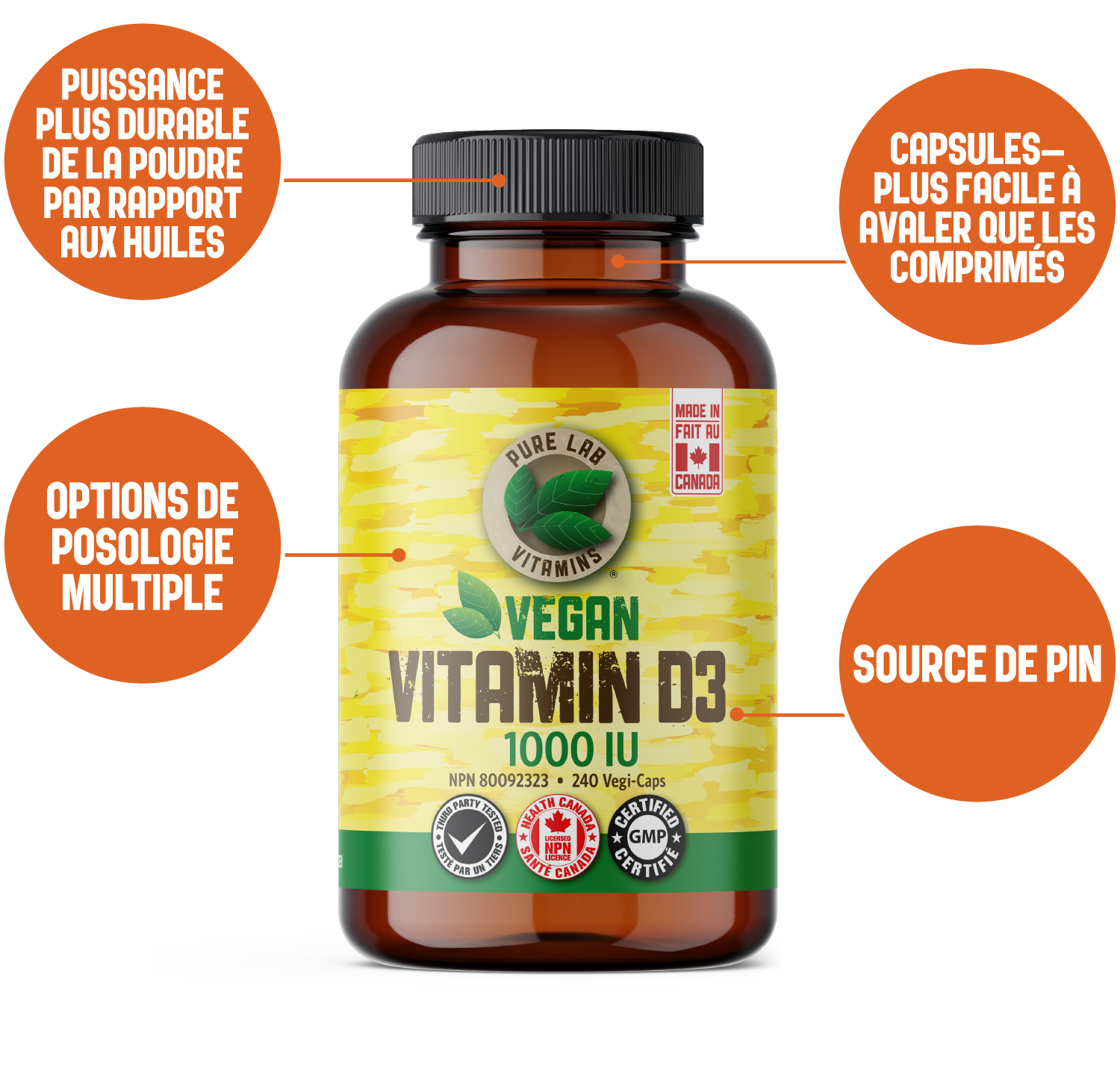 La vitamine D3 végétalienne de Pure Lab utilise VitashineMC, une vitamine D3 provenant de lichen et soigneusement étudiée, approuvée par la Vegan Society. Vitashine D3MC est également plus absorbable que la D2.