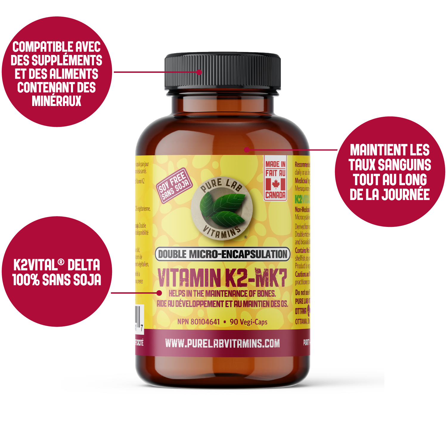 Pourquoi les vitamines K2 MK7 de Pure Lab et non les vitamines MK4? La recherche démontre que, comparativement à la forme MK4 utilisée dans certains suppléments de vitamine K2, la forme MK7 est la plus biodisponible. C’est la raison pour laquelle les vitamines K2 MK7 de Pure Lab sont composées exclusivement de la forme sèche MK7, la forme la plus efficace et stable de vitamine K2. Elle est doublement microencapsulée à l’aide d’un processus unique qui assure la compatibilité avec les aliments, les doses supplémentaires de minéraux et une longue durée de conservation.