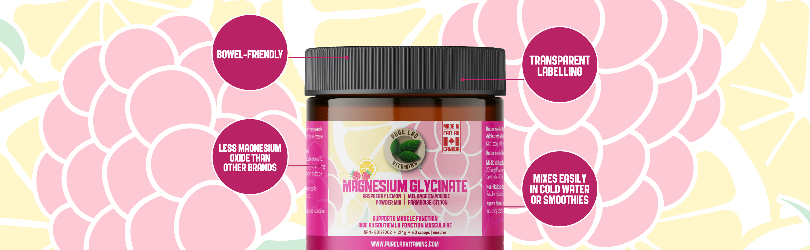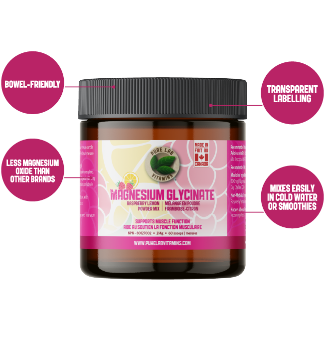 Looking for a delicious way to supplement magnesium? Pure Lab’s Magnesium Glycinate Raspberry-Lemon Powder Mix offers a naturally sweetened, flavoured, and coloured formula that’s refreshing, effective, and easy to take.